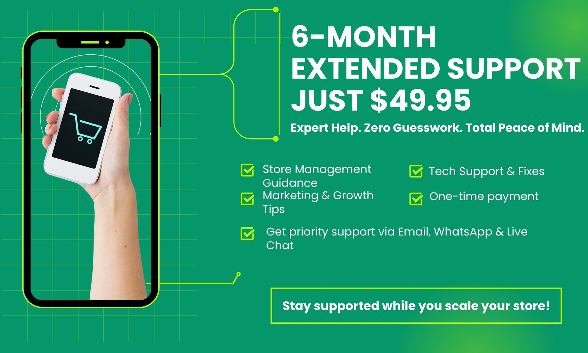 Need a hand with store setup, payment gateway integration, custom domain integration, theme changes, or basic edits? We’re just a message away to help fix any issues that come up.